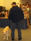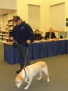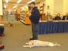 Toney takes her by her leash and walks her aournd the room directing her from area to area and within seconds, Olga alerts on the stand with audio-visual equipment atop it.