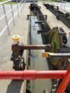 THE MATERIAL IN THE TANKS is aerated for two hours. It’s allowed to settle for an hour and a half. Then, an open trough-like device at one end of the tank sinks gently into the liquid and siphons the cleaned liquid away from the solids. The liquid goes in one direction, and the solids in another.