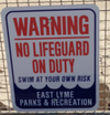 The sign states that lifeguards are only on duty Fridays, Saturdays, and Sundays from June 21 to mid-August and only from 9 a.m. to 5 p.m.