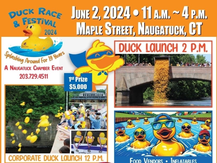 NAUGATUCK, CT–The Naugatuck Chamber’s 19th Annual Naugatuck Duck Day Race and Festival returns to downtown Naugatuck on Sunday, June 2, 2024 from 11 a.m. to 4 p.m.