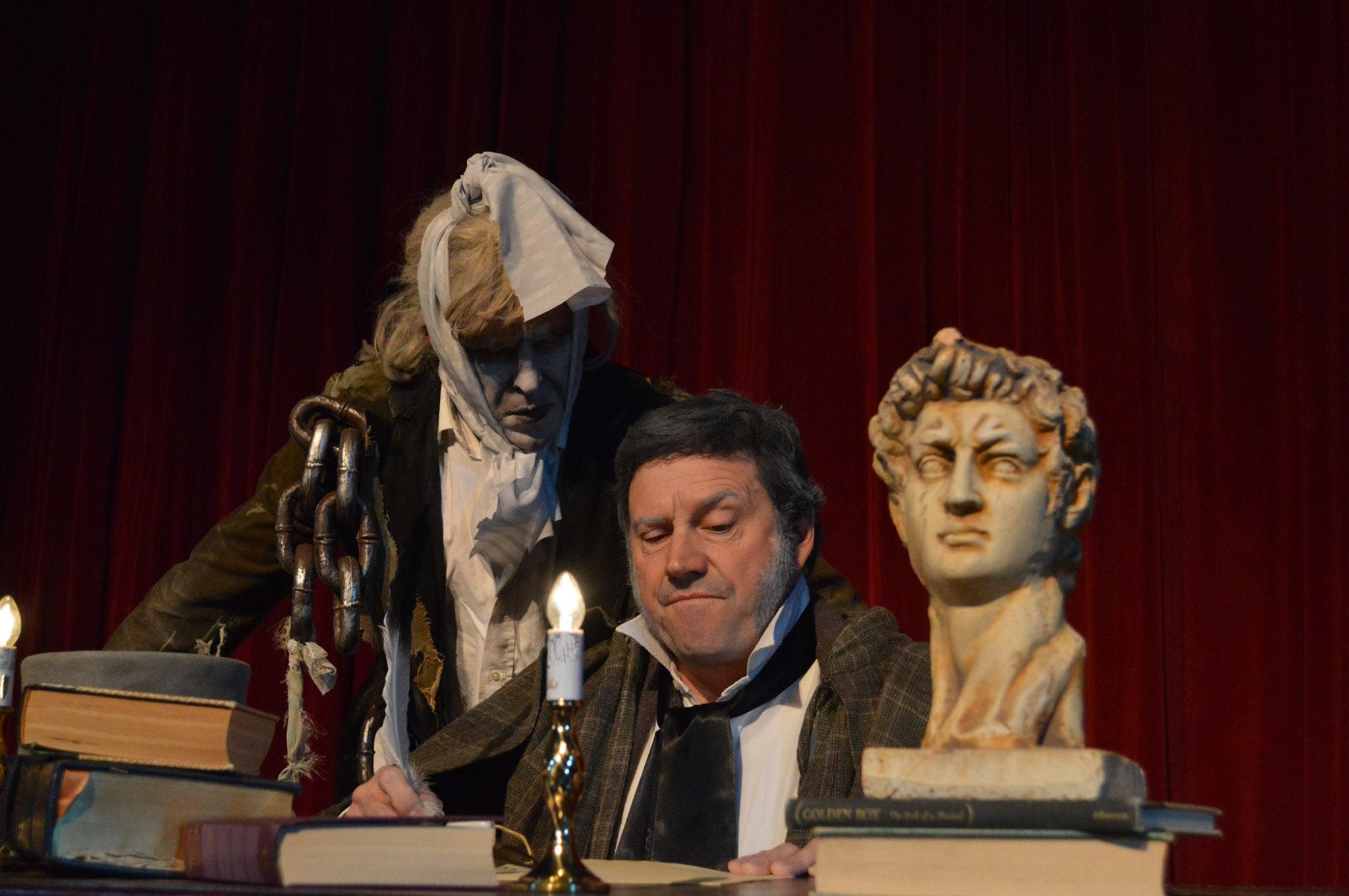 Pictured: David Macharelli as the ghost of Jacob Marley and Bob Lussier as Ebeneezer Scrooge in Landmark Community Theatre’s ‘A Christmas Carol’ Photos courtesy of LCT