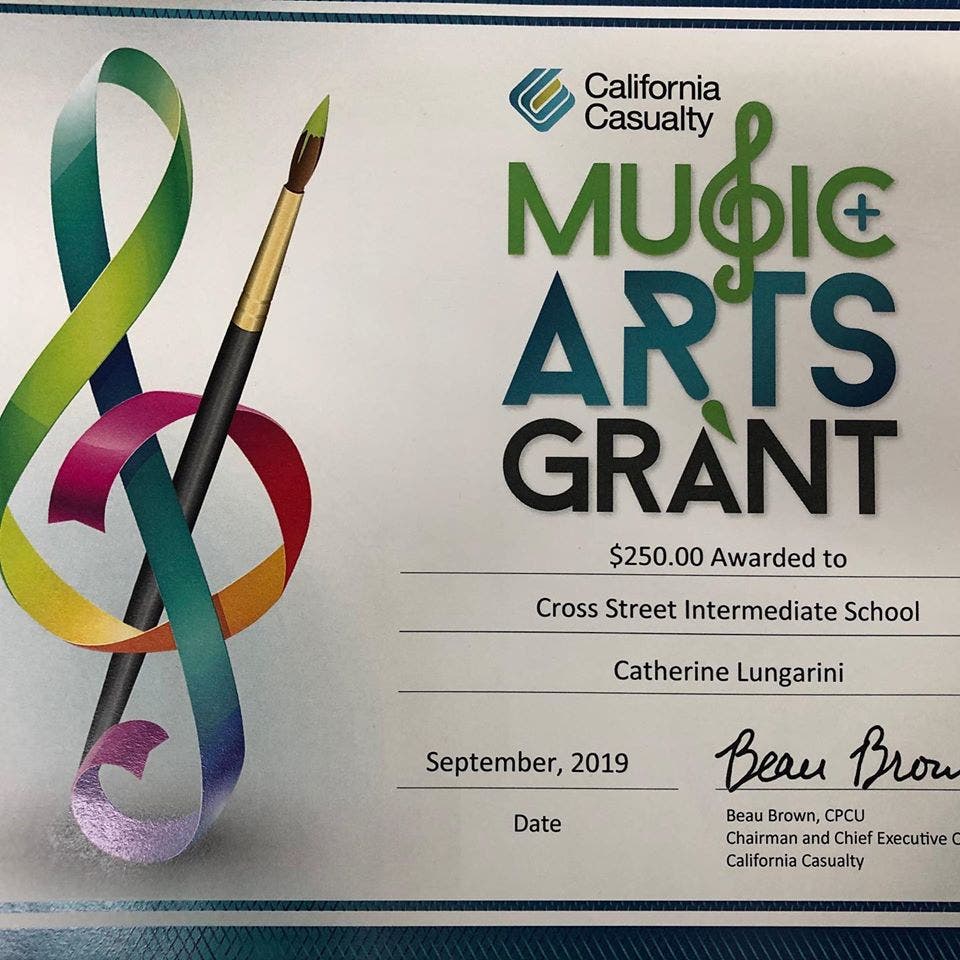 Naugatuck, CT - Cross Street Intermediate School has posted her thanks to California Casualty for the Music and Arts Grant they recently sent that will benefit her music students.