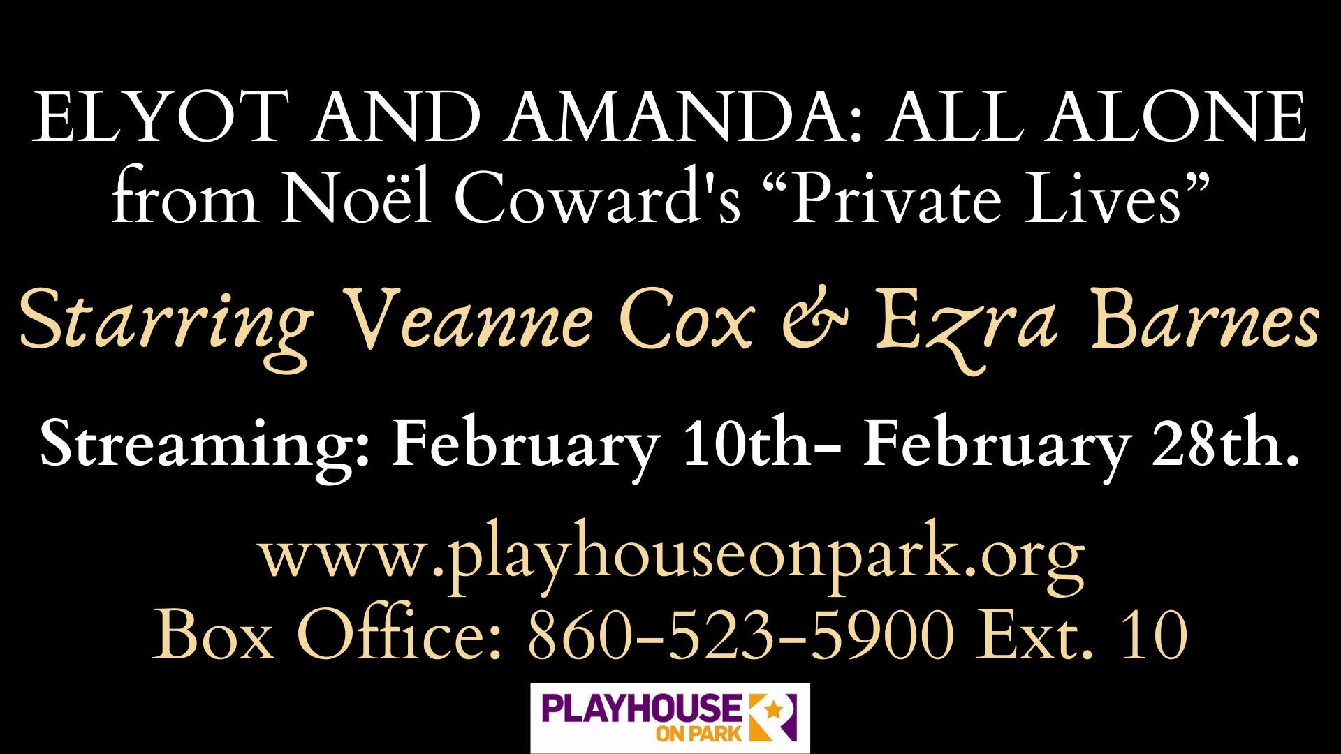 WEST HARTFORD, CT - Playhouse on Park continues Season 12 with an adaptation of Noel Coward’s PRIVATE LIVES. A reworked version of the second act of the classic play is entitled ELYOT AND AMANDA: ALL ALONE. The virtual performance by Veanne Cox and Ezra Barnes, the two actors who adapted the work specifically for Playhouse on Park, runs through Feb. 28, 2021.