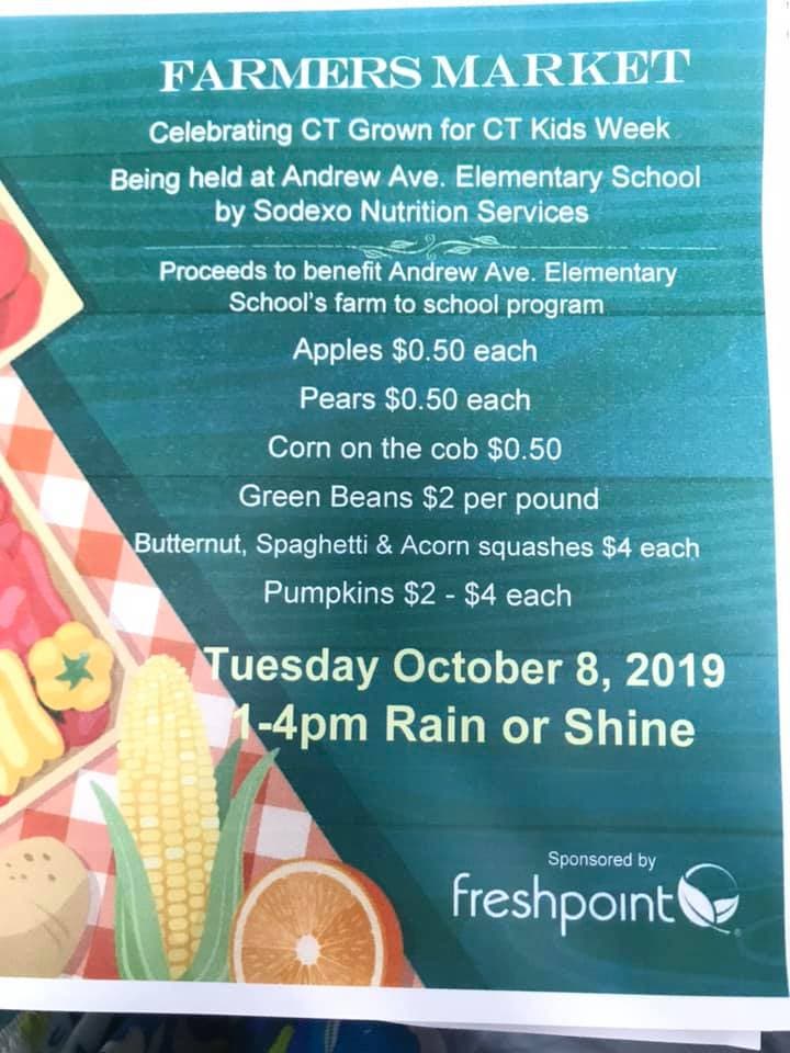 Naugatuck, CT - Sodexo will be hosting a farmers market at Andrew Ave School from 1-4pm. They will be selling fresh local produce to help support Andrew Ave.'s farm to school program.