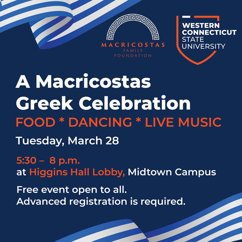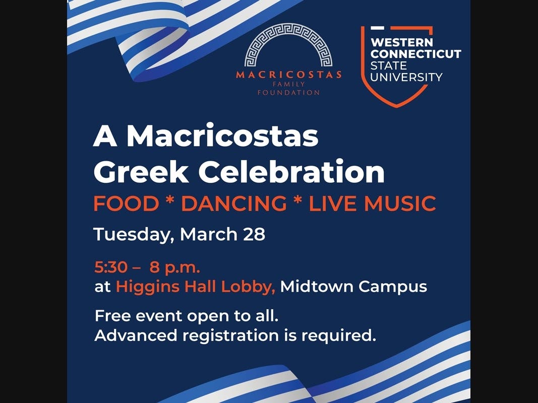 DANBURY - The tastes, sounds and art of Greece come to Western Connecticut State University on Tuesday, March 28, for the Macricostas Greek Celebration. The special evening of Greek culture is free and open to the public and will be held from 5:30 to 8 p.m. in WCSU’s Higgins Hall Lobby, Midtown campus, 181 White St. in Danbury. Advance registration is required by Friday, March 24, at https://wcsutickets.regfox.com/macricostas-greek-celebration.