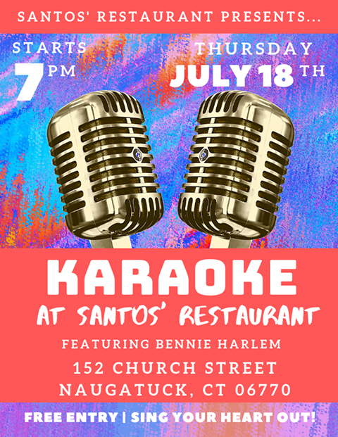 Naugatuck, CT - Santos Restaurant presents 'Karaoke Night.' Come out and enjoy a night of fun at Santos Restaurant in Naugatuck, Connecticut. Hosted by Bennie Harlem. Free Entry! Prizes and Giveaways! Tell your friends and family. We can't wait to hear you sing! #singyourheartout