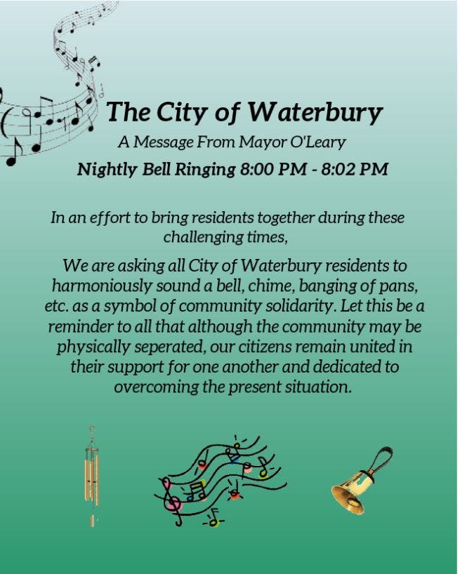 Naugatuck residents are invited to ring a bell, sing a song with a musical instrument every evening between 8:00 and 8:02pm.