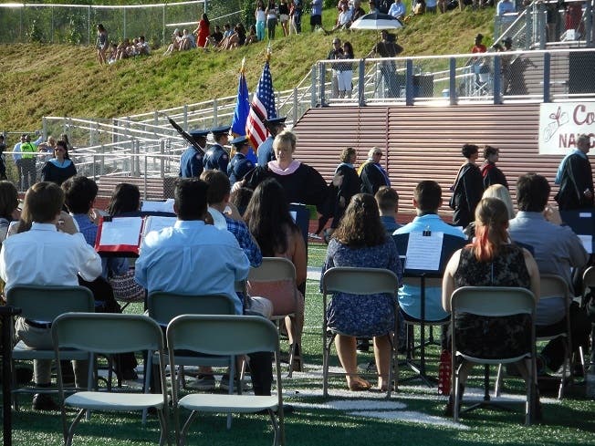 The NHS Concert and Symphonic Bands seated on the field accompanied the processional under the direction of Jennifer Fatone with βPomp and Circumstanceβ arranged by Merle J. Isaac. The seniors were led by faculty members that included most of the principals from other borough schools. Once the students had made it to their seats Presentation of the Colors was done by Air Force JROTC members, immediately followed by the βStar Spangled Bannerβ arranged by Bill Moffit. Choral music teacher Ms. Fatone directed the senior members of the Chamber Singers.