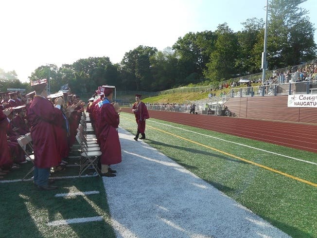 The latest graduates of Naugatuck High School exited the field through two lines of NHS faculty members and then greeted family members and friends outside the field.