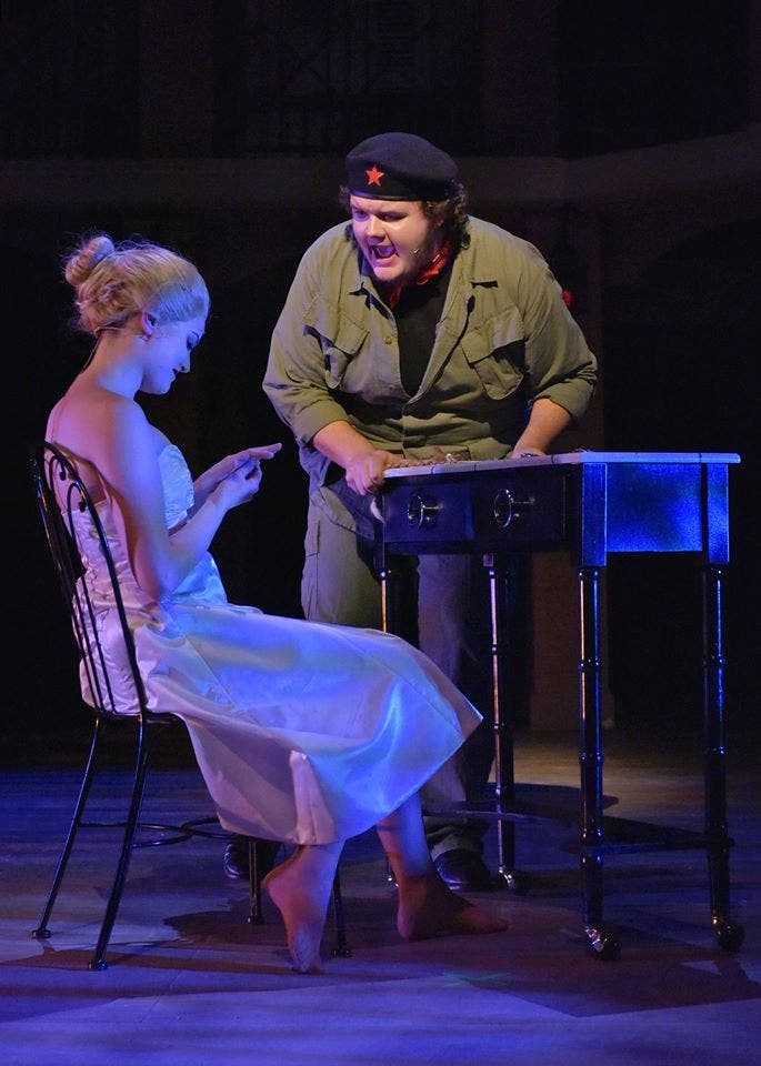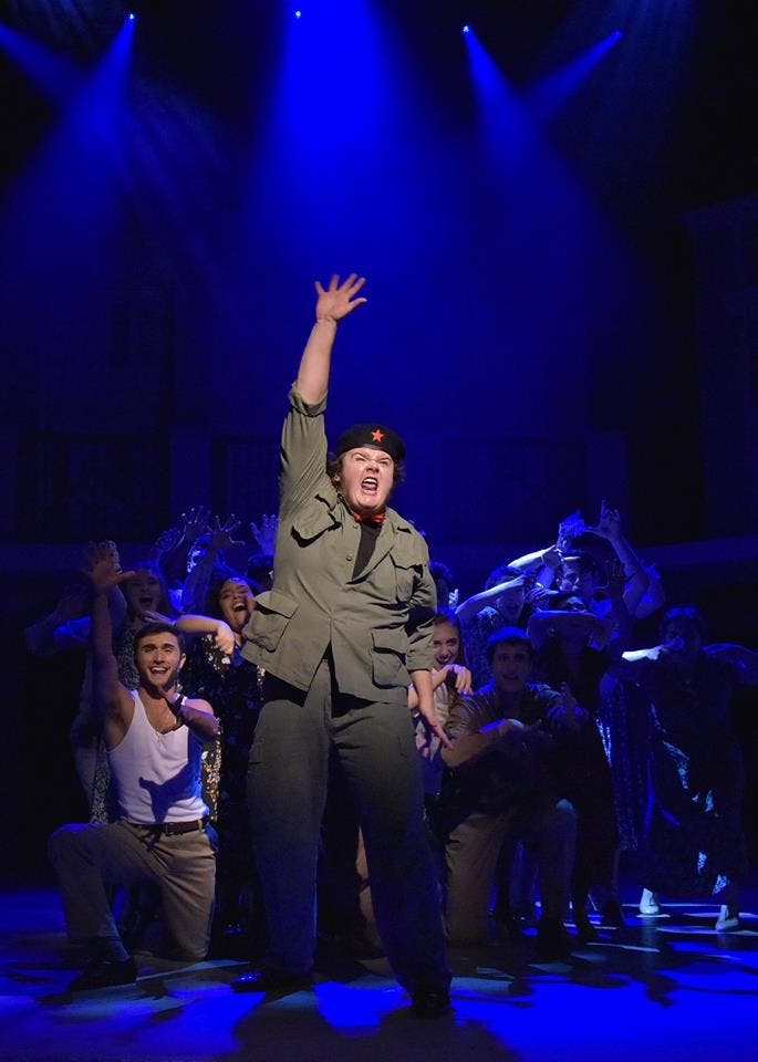 The first act of the WCSU production opens strongly with black and white film projections (by Kevin Geraghty) of the young Eva Duarte and the house announcement that the former actress and now first lady of Argentina has lost her battle with cancer at age 33. “Requiem for Evita” integrated the aisles of the theater and Che appeared out of the audience for “Oh What a Circus;” these were just the first of many effective blocking choices. “A New Argentina” closed the first act to appreciative cheers with a big theatrical bang.