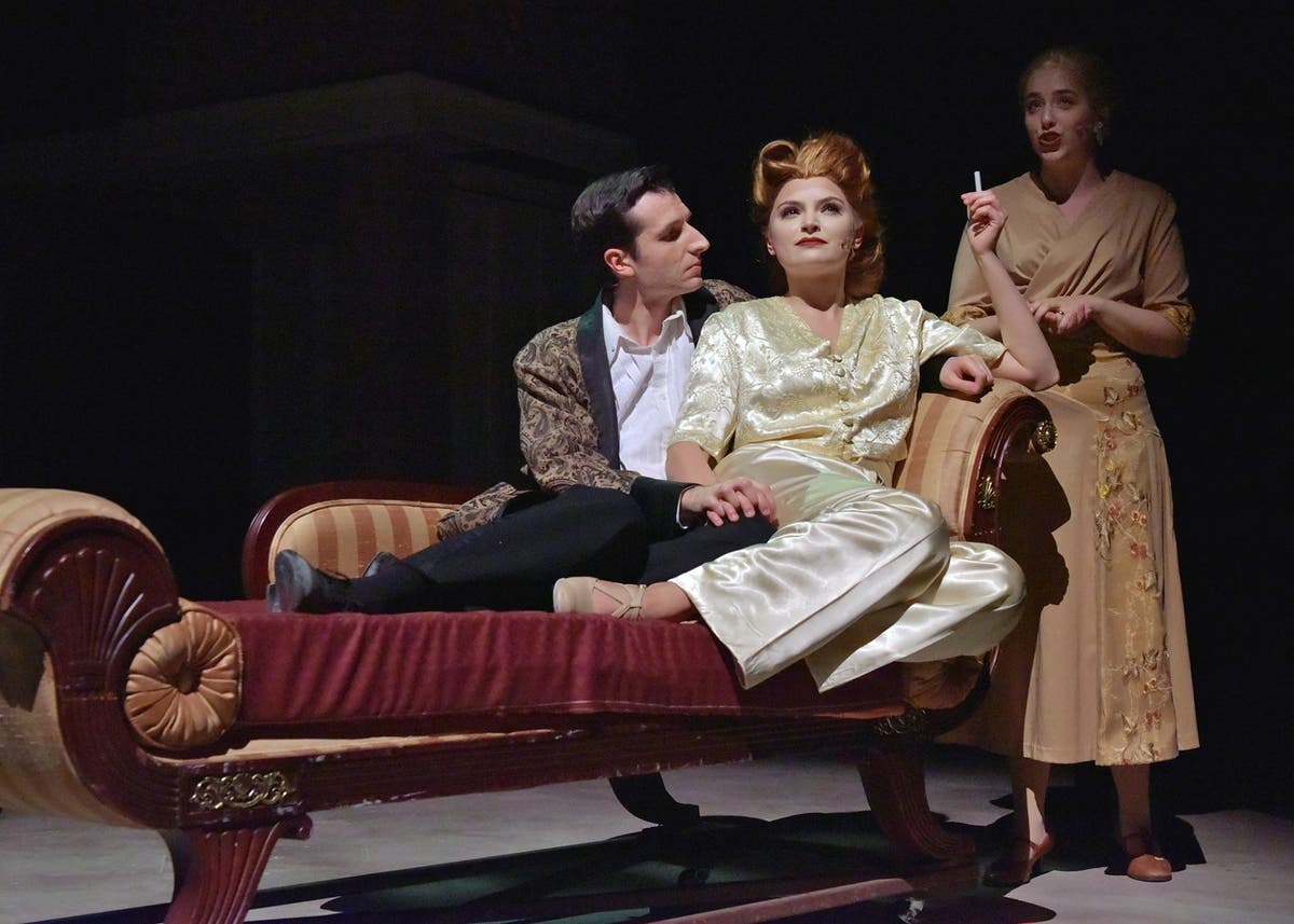 The title role of Evita was performed by three student actresses cast at the various stages of her life from her teens to her illness and death at 33. The Young Eva Duarte was performed by senior Shaylen Harger (The Chaperone in ‘Drowsy Chaperone;’) the Reigning Eva Peron, by sophomore Olivia Kurtz; and the Dying Eva, by junior Alexandra Colavecchio (Violet in WCSU’s ‘Violet.’) This worked in different way throughout the two acts; at times the trio sang together, at times the younger or older version of the character came out to remind her of the past or foreshadow the future. For the first transition, the two actors were dressed identically and spun around back to back. The iconic “On the Balcony of the Casa Rosada/Don’t Cry for Me Argentina,” when all three were dressed in the white princess gown, was to my mind a bit muddled; the rest of it worked well and all three of the ladies were equally convincing in their shared role and had the spectacular singing voices required for it.
