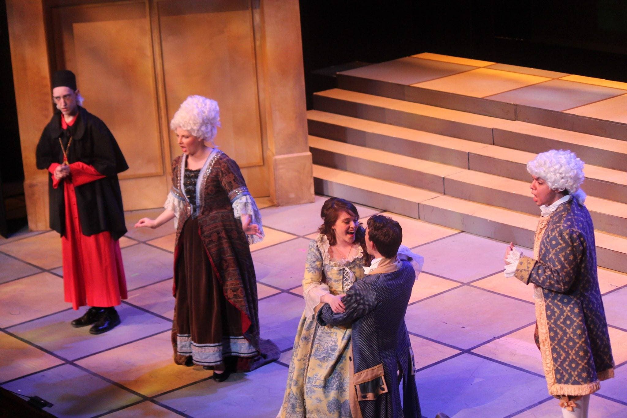 Modern musicals are certainly not easy (cue “Art isn’t easy”) but after enjoying the matinee of this production I came to realize that opera is hard! For two and half hours, the students sang lots of music, acted out scenes with lots of lines, danced a bit, and then sang some more. The large orchestra in the pit, under the direction of Dr. Fernando Jimenez, managed to keep up. There were lots of fussy costumes and wigs to manage and a gondola and a maypole thrown in for good measure. There were a lot of moving parts and even more notes (and some Italian) to memorize, and this large and well-rehearsed cast pulled it all off deftly.
