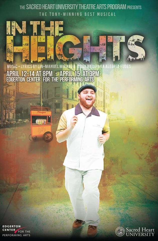 Fairfield, CT - The Sacred Heart University Theatre Arts Program is presenting their splashy spring musical this weekend. I got to attend the exciting opening night of the SHU TAPβs production of Lin Manuel Mirandaβs first musical entitled βIn the Heights.β Mr. Miranda (you may have heard of his little musical entitled βHamiltonβ) wrote the earliest draft of this high-energy show in 1999 and it played at Wesleyan Universityβs student theater companyβs second stage in 2000. Quiara Alegria Hudes wrote the current book in 2004. The development of βIn the Heightsβ was supported by the Eugene OβNeill Theater Center in CT during a residency at the Music Theater Conference of 2005 and went on to Broadway with Lin Manuel in the role of Usnavi and Christopher Jackson (George Washington in βHamiltonβ) as Benny. The show earned 13 Tony nominations and won four, including Best Musical.