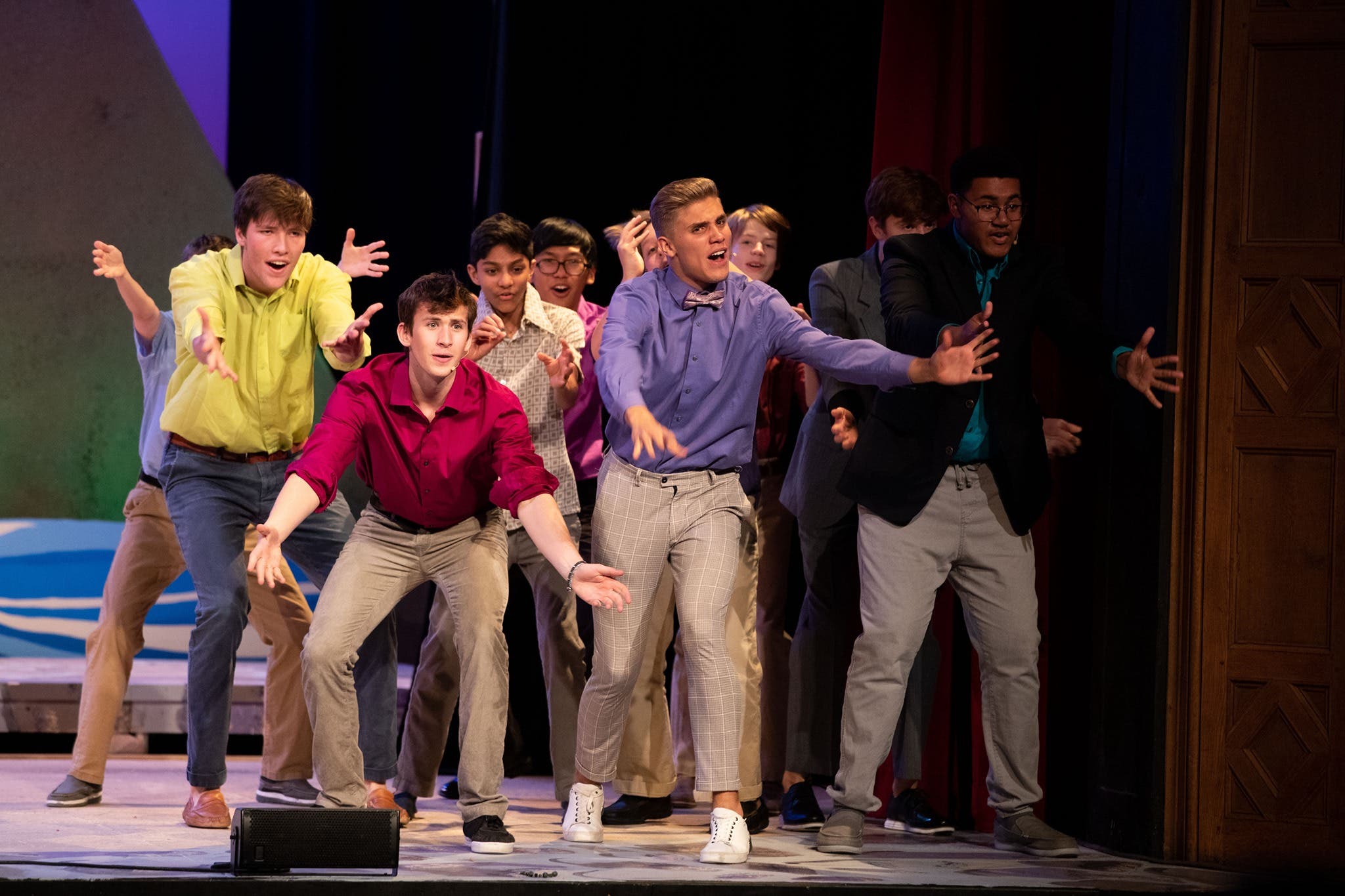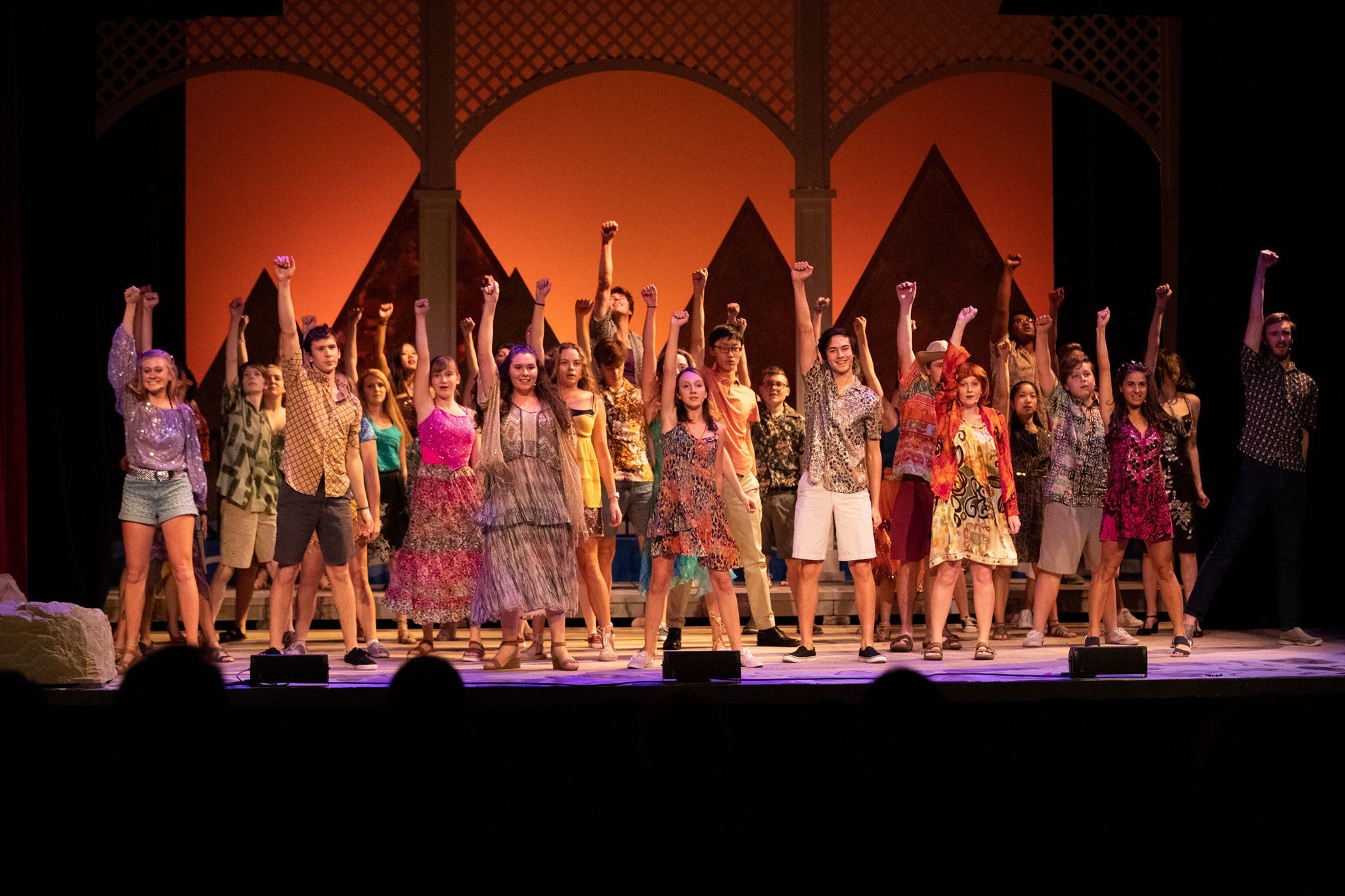 The musicians and pit singers sounded very professional as they performed the fun arrangements of the classic ABBA tunes. Mr. Thompson, who covered keyboard 1 as he always does masterfully, conducted the mix of adult and student pit members, and it was difficult to distinguish between the two. Also on keyboard were Stephen Mayer ‘22, Anna Servina ‘21, Harry Yuan ‘23 and Omi Oliver ‘23. Fred Krug and Coleman Jennings ‘20 played guitar 1 and 2, Paul Bilodeau was on bass, Harry Wang ‘21 and James Allen covered percussion, Jaden Spangenberg ‘23 (who must have been very proud of his sister Meghan) was on drums, along with Emilio Justo ‘22 and Bob Nolte. Edvin Tran Hoac ‘20 was a vocalist in the pit.