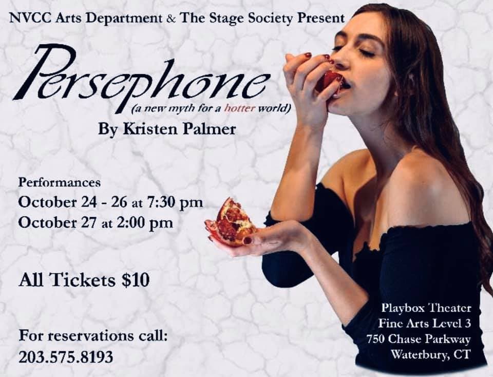 PERSEPHONE is presented by the NVCC Arts Department and The Stage Society. Remaining performances are Oct. 26 at 7:30pm and Oct. 27 at 2:00pm in the Playbox Theater in the Fine Arts Building, Level 3, 750 Chase Parkway in Waterbury. The two acts fit neatly into two hours and the seating in the black box is comfortable. Tickets will be sold at the door .