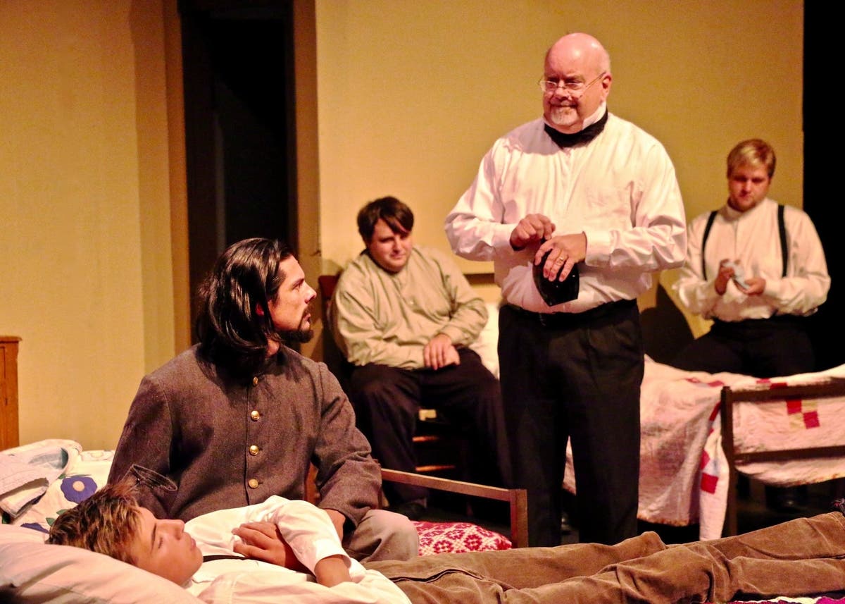 Rob Richnavsky served as fight director, although the violence was brief, and the director assembled the period costumes. Karen Willey collected the props and the director designed the hospital set. Stage Manager Lori Poulin and Ms. Willey dressed it with period-accurate touches, like wreaths and clusters of herbs which were used to repel insects and control odor. During the intermission there was a whiskey tasting, with one offering called Root Beer.