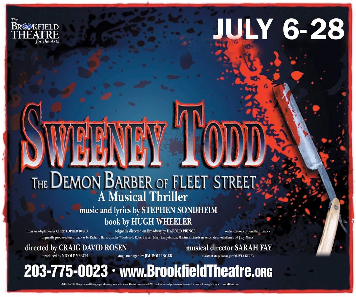 Brookfield, CT - My summer of Sweeney continued this weekend when I attended the opening night of SWEENEY TODD The Demon Barber of Fleet Street at The Brookfield Theatre for the Arts. So to recap, the musical thriller is famous for its music and lyrics by Stephen Sondheim, a book by Hugh Wheeler from an adaptation by Christopher Bond. The TBTA production was directed by Craig David Rosen, produced by Nicole Veah and musical direction by Sarah Fay.