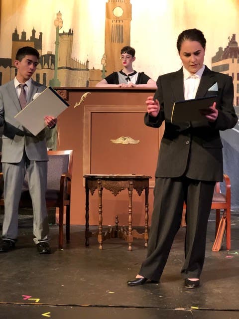 Benjamin Dressel (JOSEPH AND THE AMAZING TECHNICOLOR DREAMCOAT, ROMEO AND JULIET) is extremely effective in the role of accused Leonard Vole. He understood the angst while still retaining the charm of his character. Ms. Dressel is a freshman at Pomperaug HS. Jessica Sember, a senior at Naugatuck HS who appeared in JOSEPH, WORKING, R&J and other NTT shows, gave a most impressive performance as the legendary Sir Wilfrid, in gender bending casting, wearing a great vintage suit and even pretending to smoke an old-fashioned pipe. In her bio, expresses her deepest gratitude to “the man, the myth, the legend, Mr. Rosa. Mr. Rosa has helped Jessica through all sorts of problems and she is so grateful that he decided to stay and ‘graduate’ with the class of 2019.”