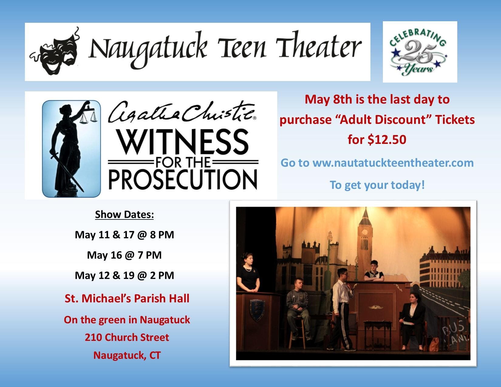 Naugatuck, CT - Naugatuck Teen Theater is celebrating their 25 year anniversary this year. For the last three months, the teens have been in rehearsal for their spring play, Agatha Christie’s WITNESS FOR THE PROSECUTION, under the direction of Lucia Dressel.