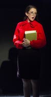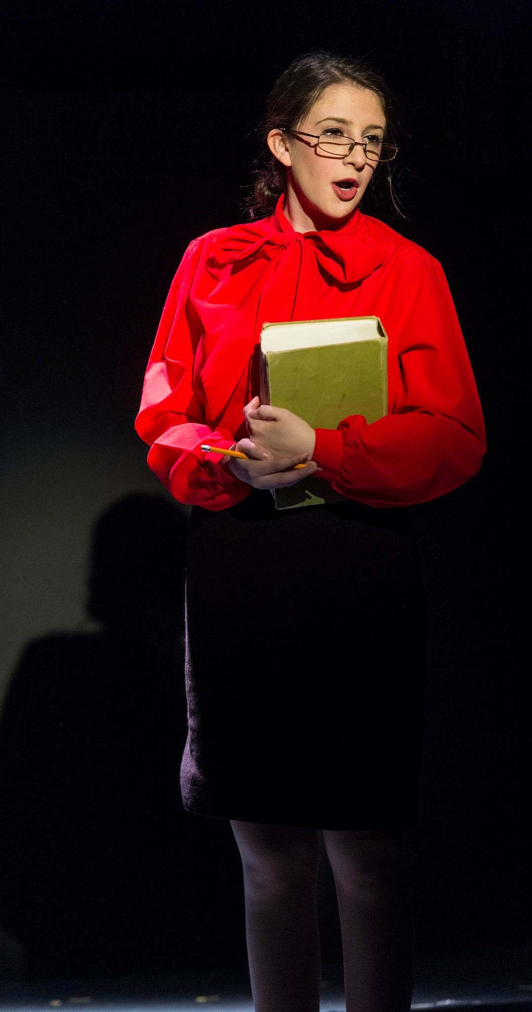 Junior Patrick Robinson served as producer and greeted everyone at the door. Mr. Carusone, the Assistant Director of Theatre at SHU who teaches voice and musical theatre, made sure that every singer sounded their best, either in chorus or while soloing. Opening night had a least one lighting snafu, but in general I was impressed at how well the students are always able to light the brick-walled former chapel. The black set was reminiscent of the last production, but worked for the needs of this piece with the exception of a tiny opening through which actors had to duck and turn sideways to exit, and the costumes of sophomore Alexa Kober, designing for the first time at SHU, “popped” against the background.