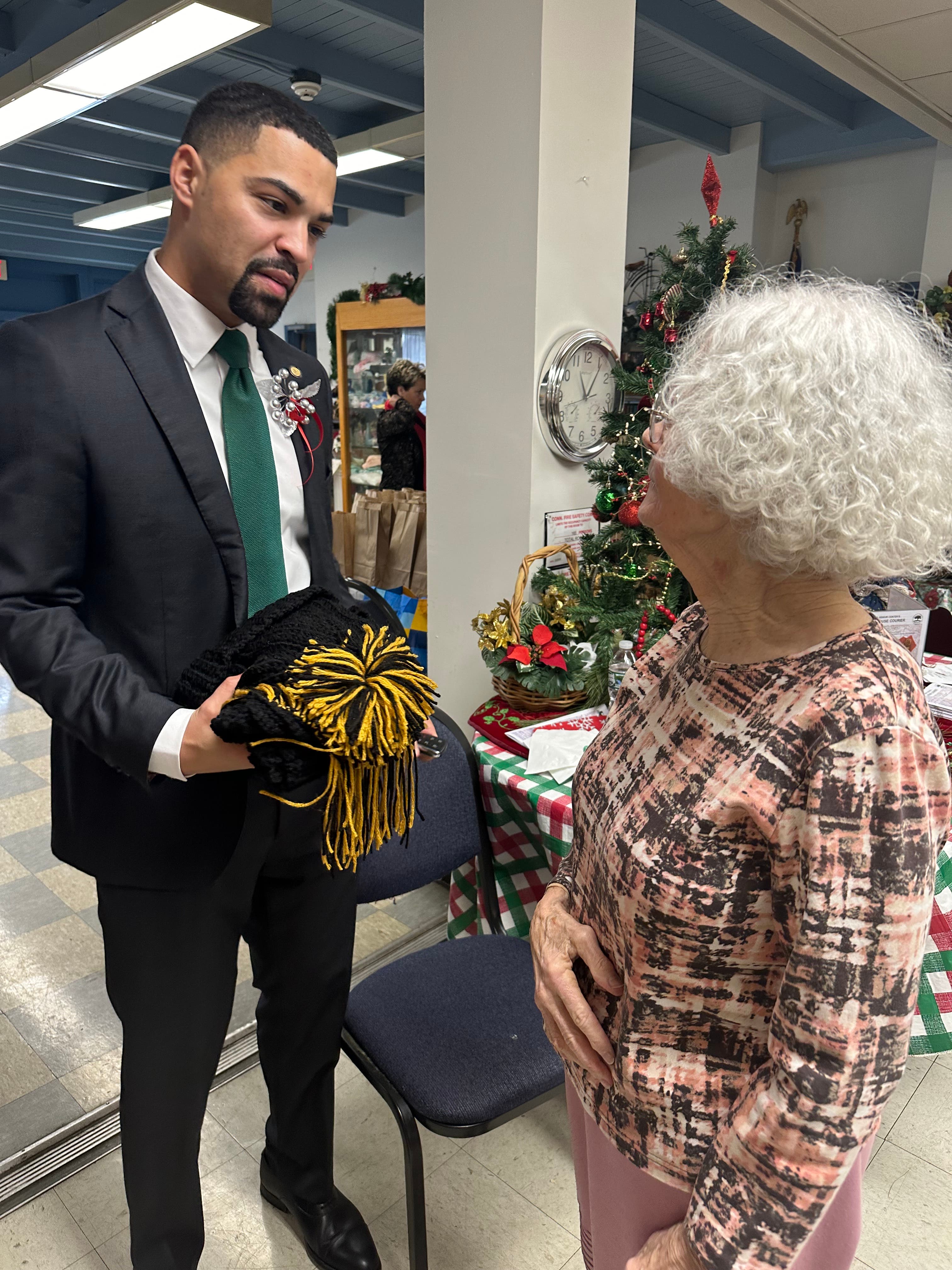Frydman explained that he had asked what were Russellβs favorite colors and one of the talented members of the senior center handcrafted a black and gold hat and scarf to present to him during his visit to Naugatuck.