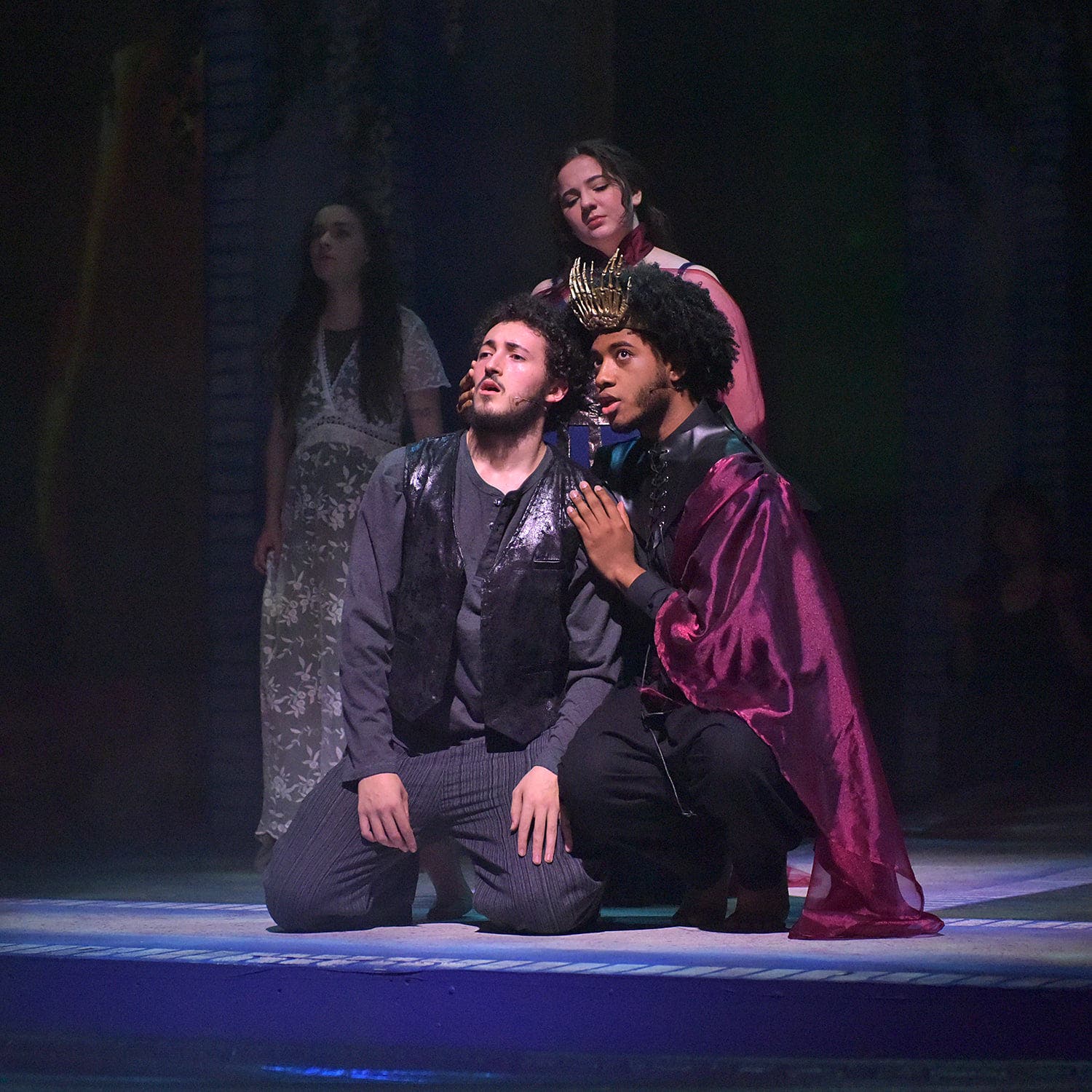 Understudy Leo Faitakes, of Brewster, New York; sophomore Immanuel Farmer, of New York, New York, as Midas, Hades, and Phaeton; senior Sean Gorman, of Bethel, as Erysichthon, Cinyras, Apollo and others; understudy Colby Groves, of Woodstock; understudy Grace Goosman of Endwell, New York; junior Teagan La’Shay, of Seymour, as Eurydice, Therapist and narrators; junior Cara Leahy, of Pawling, New York, as Midas’ daughter Little Girl, Q and Attendant; junior Tori M. Lopez of Westchester, New York, as Alcyone; junior Michael Moriarty, of West Haverstraw, New York, as Servant, Poseidon, and Orpheus; sophomore Anna Raymond, of Pomfret, as Eurydice, Myrrha and Narrators.