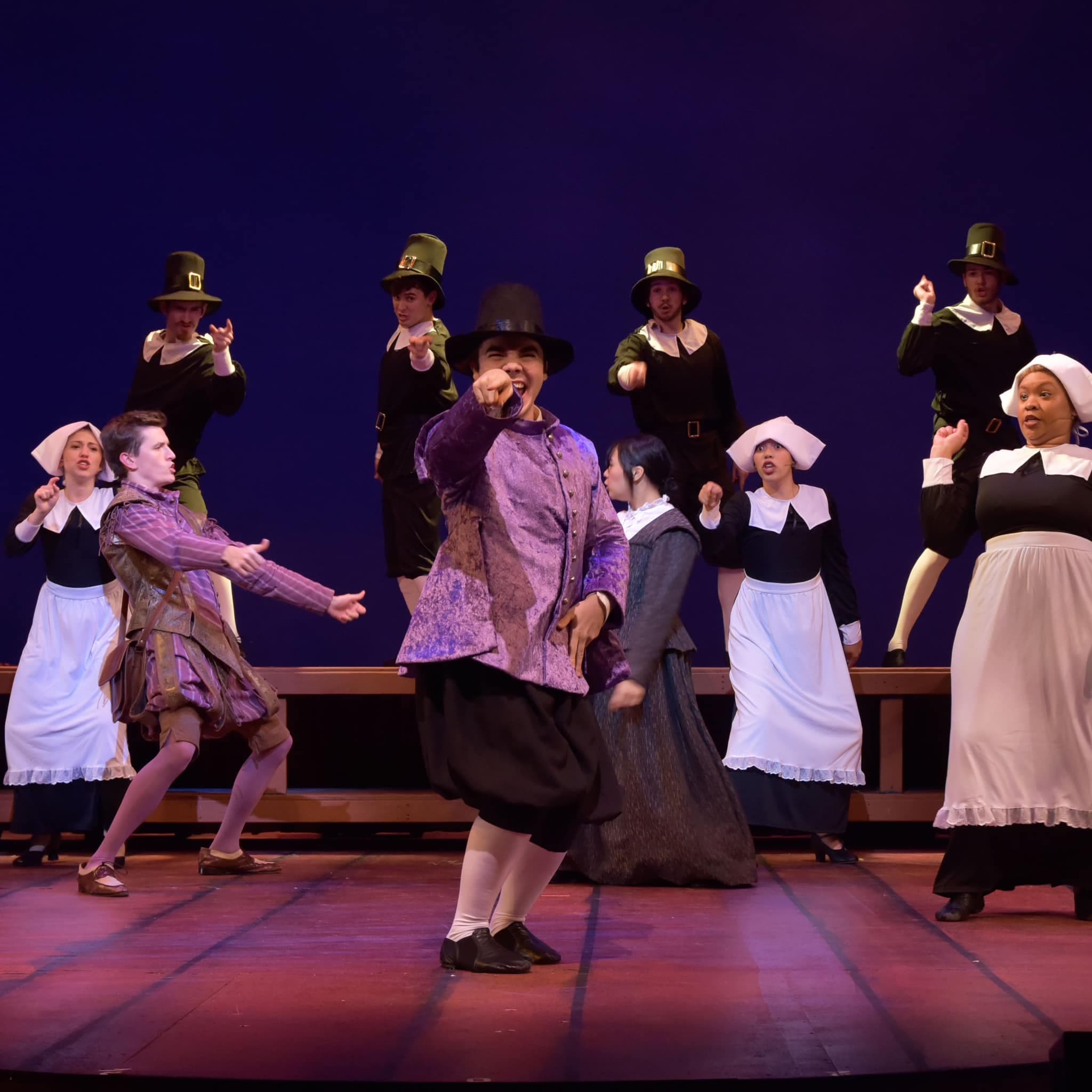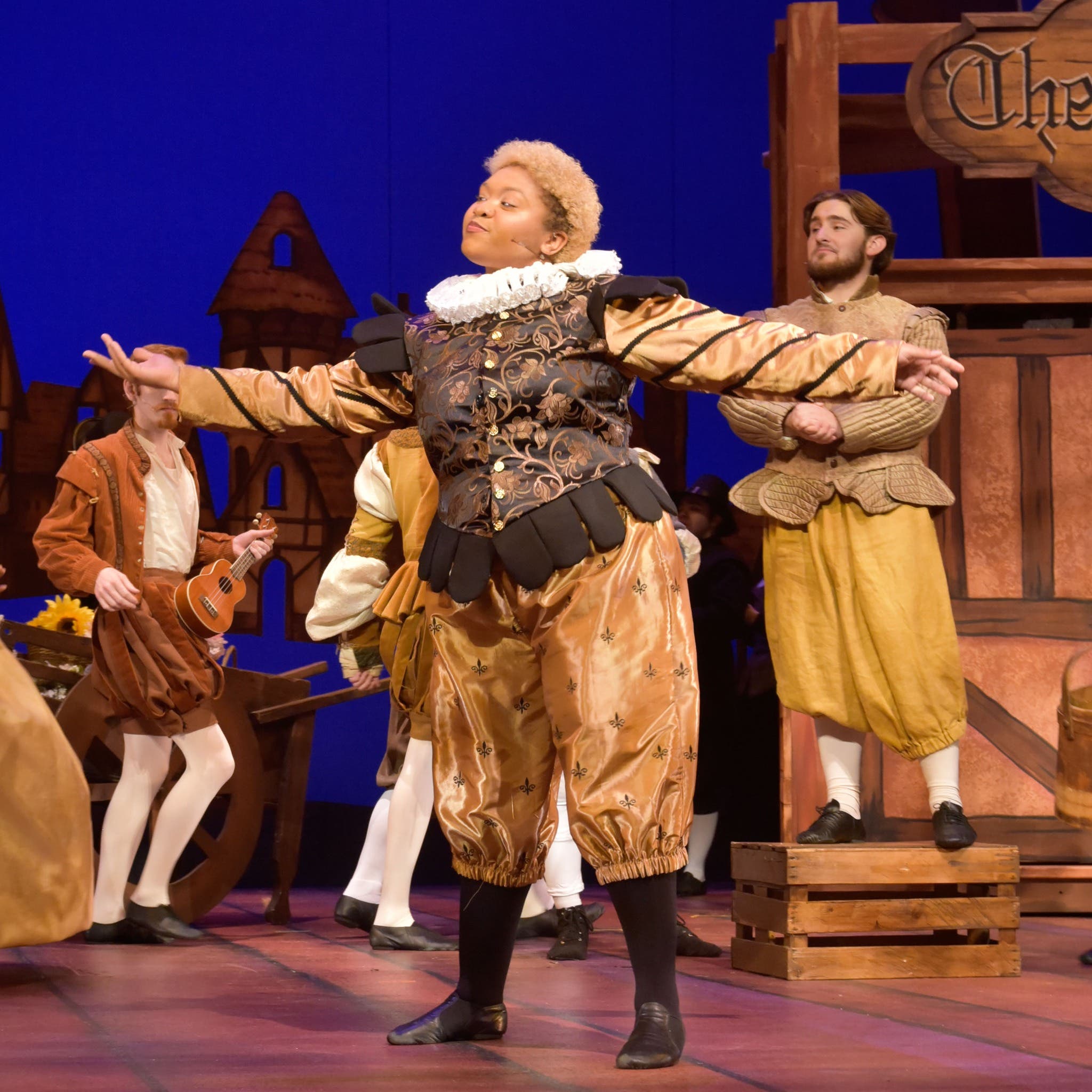 Sophomore Rachel Rosenberg (βMarat/Sadeβ) plays theatrical producer Shylock, a role that she lists as an outside credit in a junior version of this show, and junior Jonah King (βAllegroβ) steps out of the ensemble to play the role of Brother Jeremiah, Portiaβs pious father. Michael Ramsey, a senior from Armonk, NY who appeared in βBat Boyβ and βAllegro,β plays the Bottom brothers flamboyant patron Lord Clapham. Junior Imani Smith (pictured below) does really well as the minstrel that opens the show and serves as the understudy for Shakespeare. The rest of the ensemble adds so much to the scenes in which they sing and dance, much of it in tap shoes. The students look like they are having a great time being a part of this production and it spreads out to the audience.