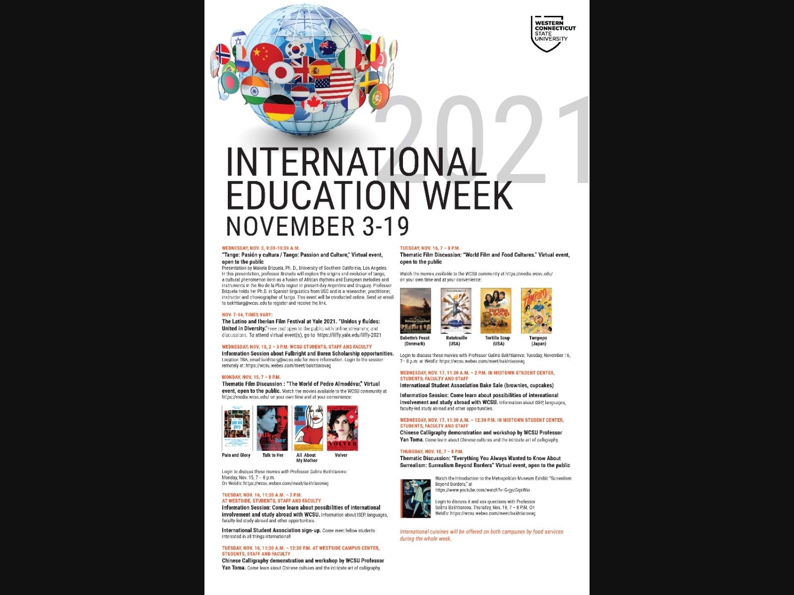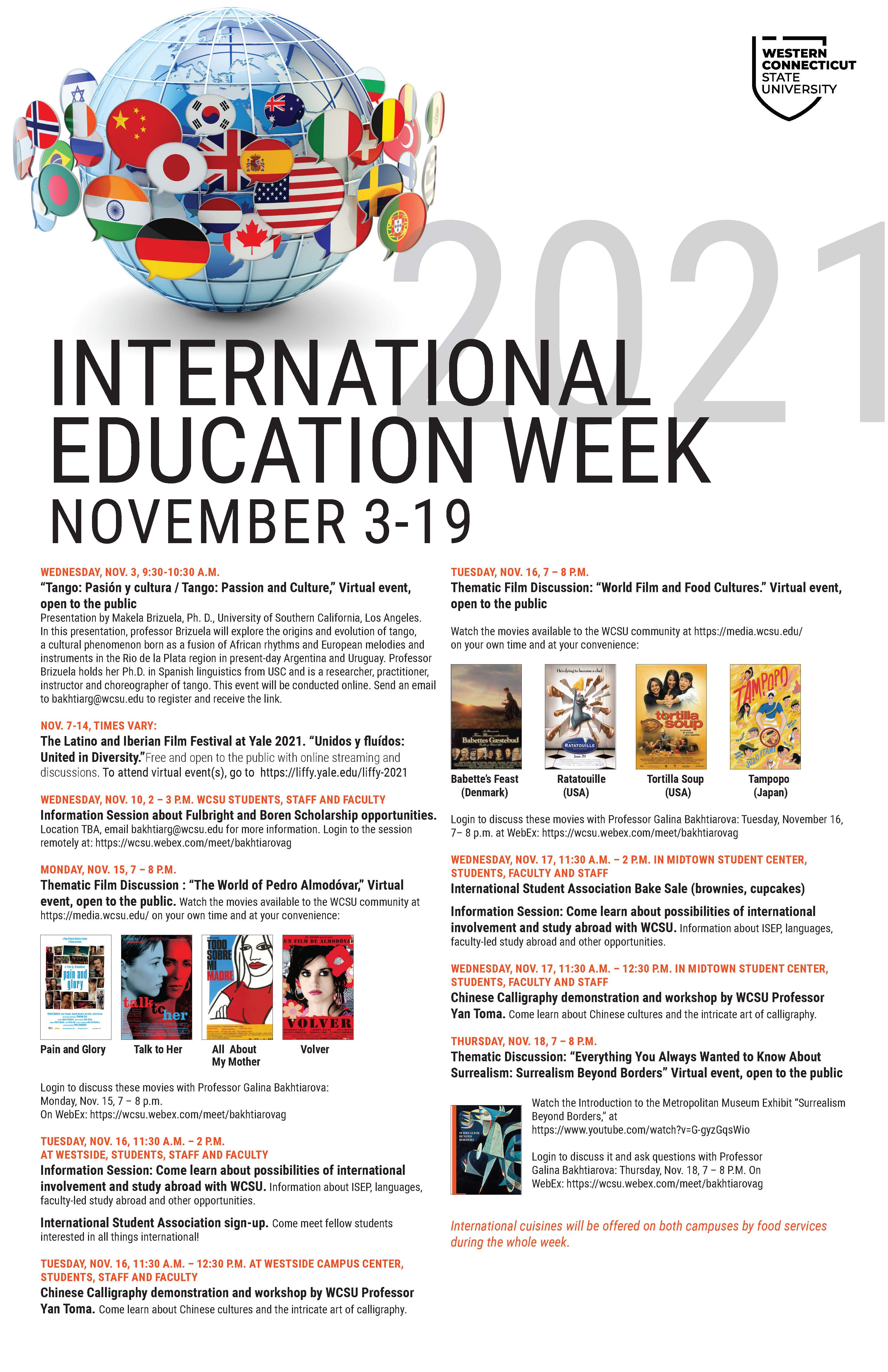 - βSurrealism Beyond Borders,β the introduction of the Metropolitan Museum of Art exhibit, at www.youtube.com/watch?v=G-gyzGqsWio β virtual discussion βEverything You Always Wanted to Know About Surrealism: Surrealism Beyond Bordersβ at 7 p.m. on Thursday, Nov. 18, at https://wcsu.webex.com/meet/bakhtiarovag. ###/ulhttps://liffy.yale.edu/liffy-2021. WCSU hosts International Education Week to help students expand their knowledge of the world and experience different cultures, and to promote diversity. As part of this effort, the university will host events for students including information sessions about opportunities of international involvement and study abroad, including Fulbright and Boren scholarships. Many WCSU students have earned these coveted scholarships and expanded their education overseas. Other offerings during the week include Chinese Calligraphy and culture, the history of the Tango, access to the International Student Association, and international cuisine served during food services on both campuses. International Education Week was designed as an opportunity to celebrate the benefits of international education and exchange worldwide and is a joint initiative of the U.S. Department of State and the U.S. Department of Education. ,>