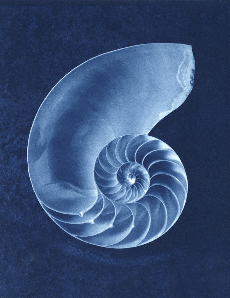 Such processes, while sometimes difficult to comprehend for the viewer, produce stunning results. The jewel-like quality of Hal Schwartz’s platinum palladium prints stems from his application of 24k gold leaf. Dan Lenore’s striking blue image of a Nautilus shell was achieved using the cyanotype process, in which chemicals produce a cyan-blue print.