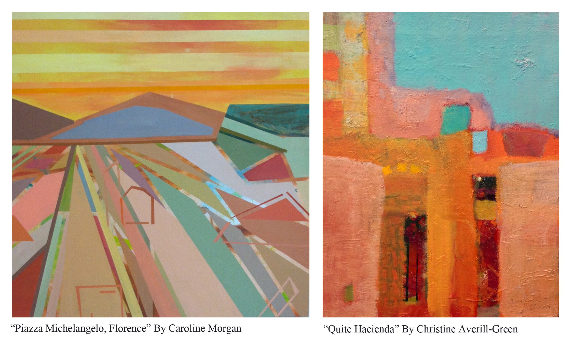 Averill-Green and Morgan’s work follows a theory of Claude Monet of seeing the world through shapes and colors rather than familiar objects and scenes. “When you go out to paint, try to forget what objects you have before you…merely think here is a little square of blue, here an oblong of pink, here a streak of yellow and paint it just as it looks to you.” Caroline takes inspiration from her extensive travels to create an environment of bold shapes and colors within her work, allowing her pieces to provide a fresh perspective on landscape painting. Averill-Green, also uses this idea within her work, playing with a balance between abstract and representation to create her unique style. Her work, as she states stems from a “fascination with the textures and layers, colors and mysteries of our own lives.”