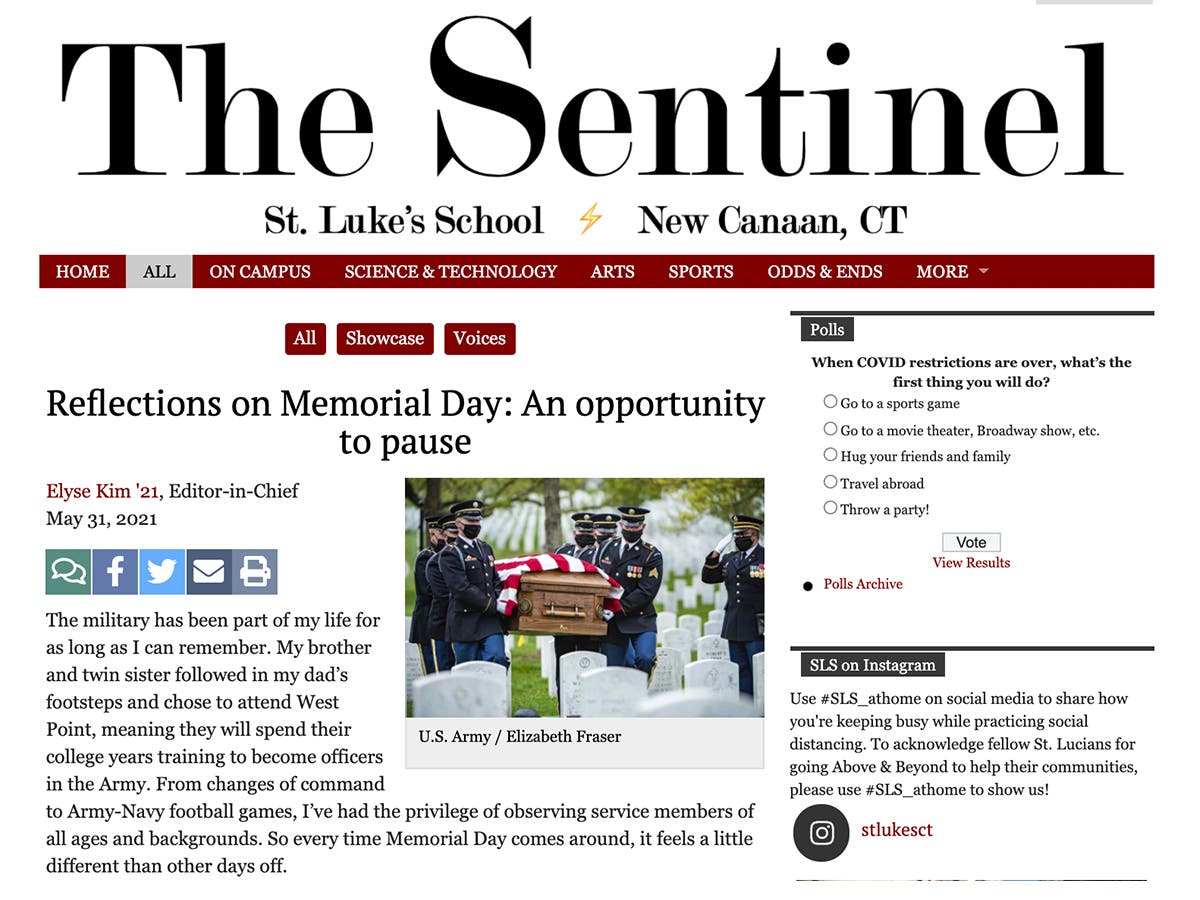 Elyse Kim '21, a senior at St. Luke's School and Editor-in-Chief of the student newspaper The Sentinel, shares her connection and personal reflection of Memorial Day in this op-ed, "Reflections on Memorial Day: An opportunity to pause."