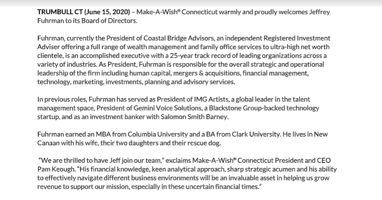 "Make-A-Wish® Connecticut warmly and proudly welcomes Jeffrey Fuhrman to its Board of Directors."