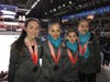Photos courtesy of the Skyliners Synchronized Skating Team: (image 1) from left: Nikka, Sophie, Taylor and Kat; (image 2) Juvenile line in white; (image 3) Intermediate line in dark blue; (image 4) Novice line in turquoise dresses
