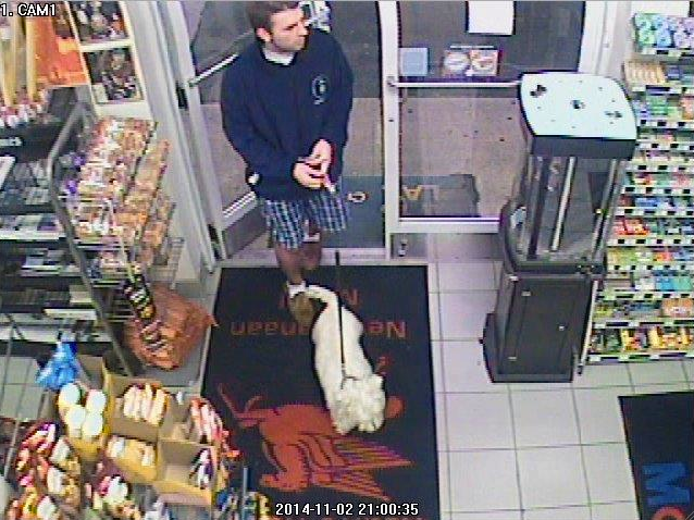 New Canaan police are asking for the public’s help in finding the man in slippers with the little white dog who, they say, passed a counterfeit $2 bill at the downtown Mobil gas station.
