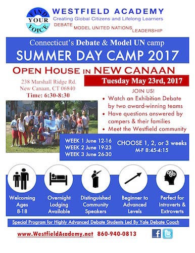 OPEN HOUSE in New Canaan for Westfield Academy's Debate & Model UN Summer Camp. Choose from 1, 2, or 3 weeks: JUNE 12-16; 19-23; 26-30.
