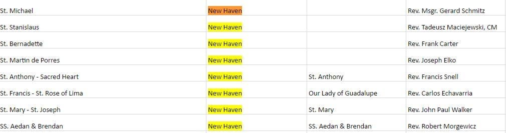 In New Haven there will be a number of mergers. St. Mary and St. Joseph will merge into St. Mary. St. Francis and St. Rose of Lima will merge and become Our Lady of Guadalupe. St. Anthony and Sacred Heart will become just St. Anthony. SS Aedan & Brendan already merged at the beginning of the year.