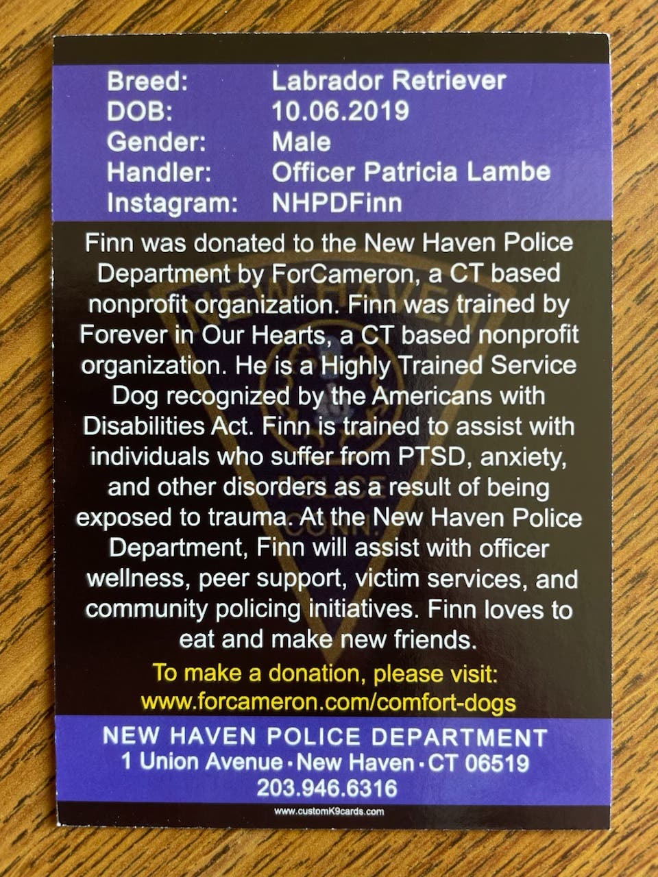 The highly trained, three and a half-year-old Yellow Labrador Retriever was donated to the department by the local nonprofit For Cameron and trained by Forever in Our Heart Foundation. Finn is the police department's first comfort dog and is recognized by the Americans with Disabilities Act, police said.