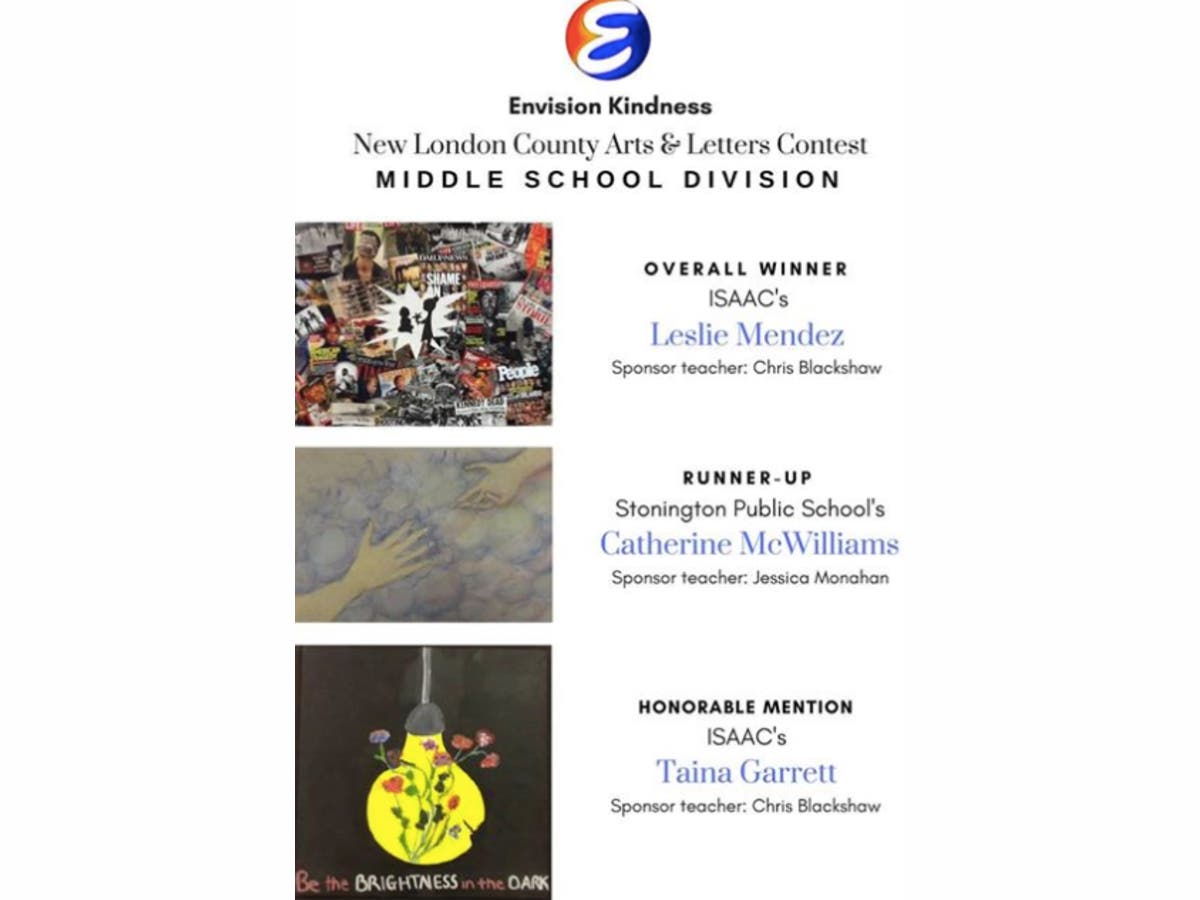 Envision Kindness is excited to announce that the winners for the New London County Arts & Letters Contest include students from Norwich Free Academy, Bacon Academy High School, the Interdistrict School for Arts and Communications (ISAAC) and Mystic Middle School. Winning schools were awarded prizes ranging from $250 to $75 to support arts programs.