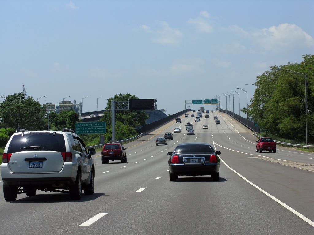 The Gold Star Bridge, spanning the Thames River between Groton and New London, is, at more than 5,900 feet, the longest bridge in Connecticut. The northbound bridge, which once carried I-95 traffic in both directions, opened in 1943. Thirty years later, a new southbound-only bridge was erected alongside the old one, which now carries northbound traffic exclusively. Combined, the two bridges carry about 100,000 vehicles per day.
