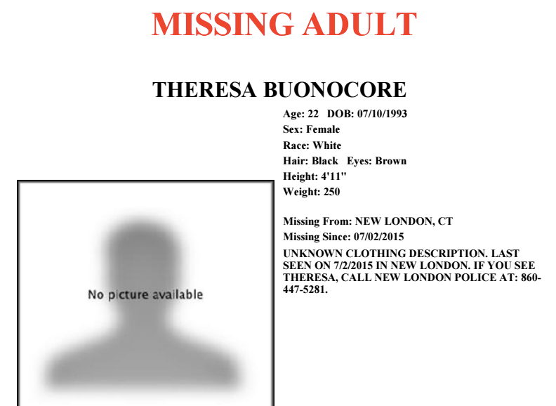 Theresa Buonocore, 22, was last seen in New London on July 2, 2015.