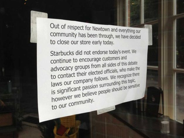 I want to say thank you to the owners of Starbucks on Church Hill Rd . With all the controversy spinning out of control on Friday they did what was right for our community. In the best interest of our children they closed there doors at 4:30pm putting an end to the N,R.A having a rally of gun owner walking around with open showing of there weapons. Having 100 people walking around with guns exposed, TV crews lining the roadway and the spot light of the world watch us again. They did what was right and I applaud them. This was the last thing our children needed to see. The owners of the store will take some heat from corporate for doing that but they did what was right for our community and now have many more friends here in Newtown. They are true Heroes for standing up and doing what was right and in the best interest of our children.