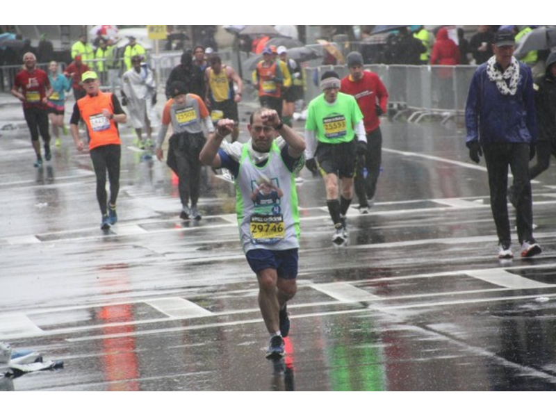 Courtesy Photo: Amidst the rainy chill, Jon Pleva finished the Boston Marathon in memory of Cub Scout Chase Kowalski.