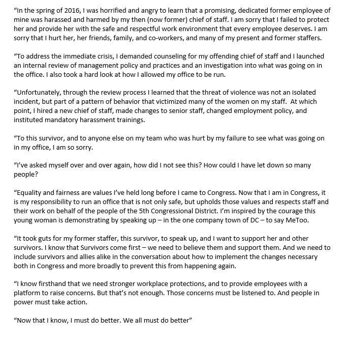 Esty has released a statement on her official Twitter in which she apologizes to the unnamed "survivor" of the assault "and to anyone else on my team who was hurt by my failure to see what was going on in my office."