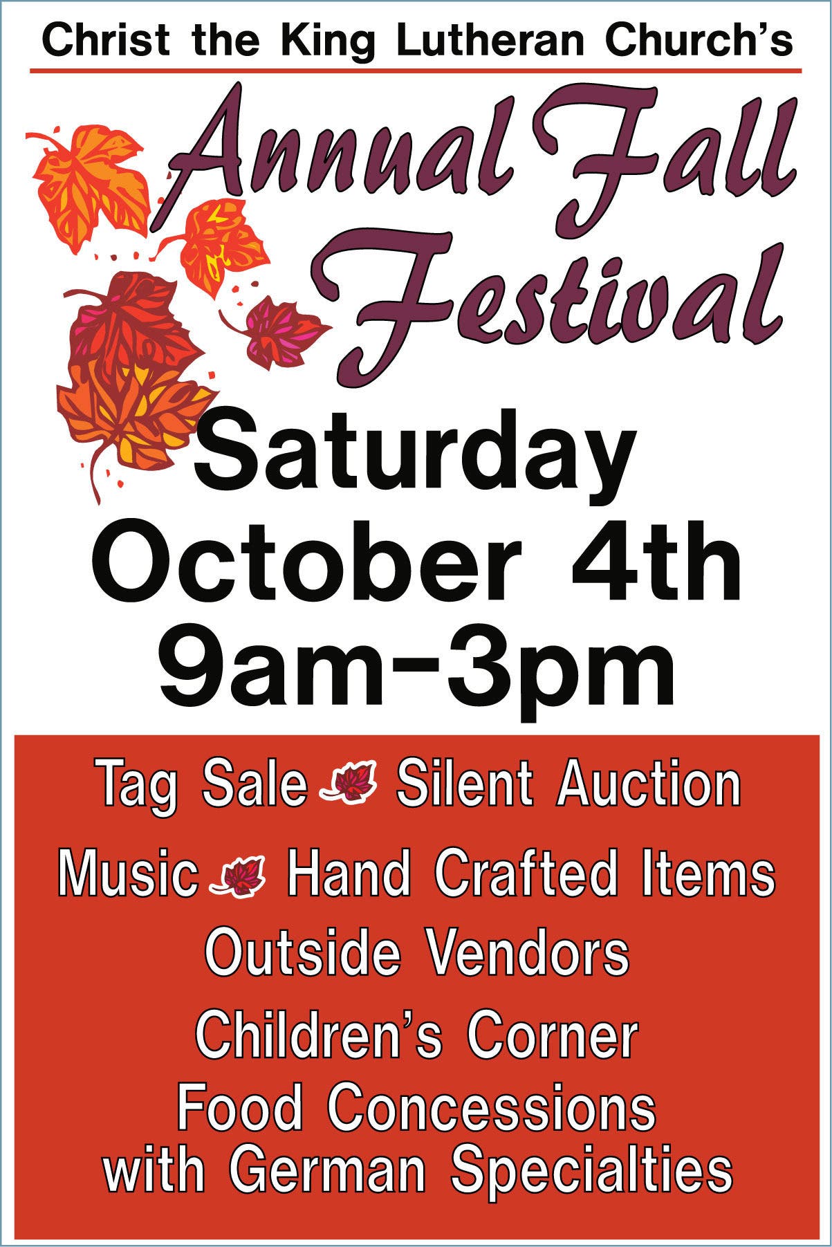Christ The King Lutheran Church, Newtown, CT will host its annual Fall Festival and Tag Sale on Saturday, October 4th from 9am-3pm.