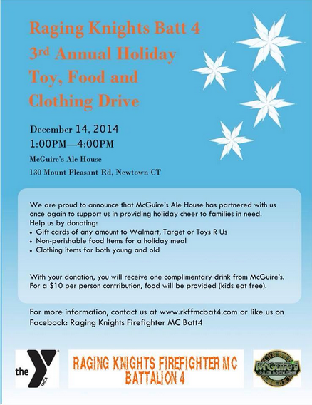 The Raging Knights Firefighter MC Battalion 4 will be hosting their 3rd Annual Toy Food and Clothing Drive on Sunday December 14 at McGuires Ale House in Newtown. The drive will be benefitting 9 families throughout the Regional YMCA of Western CT.