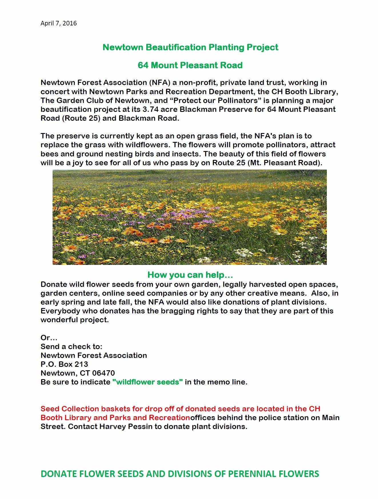 Newtown Forest Association (NFA), a non-profit, private land trust, working in concert with Newtown Parks and Recreation Department, the CH Booth Library, the Garden Club of Newtown, and "Protect our Pollinators" is planning a major beautification project at its 3.74 acre Blackman Preserve for 64 Mount Pleasant Road (Route 25) and Blackman Road.