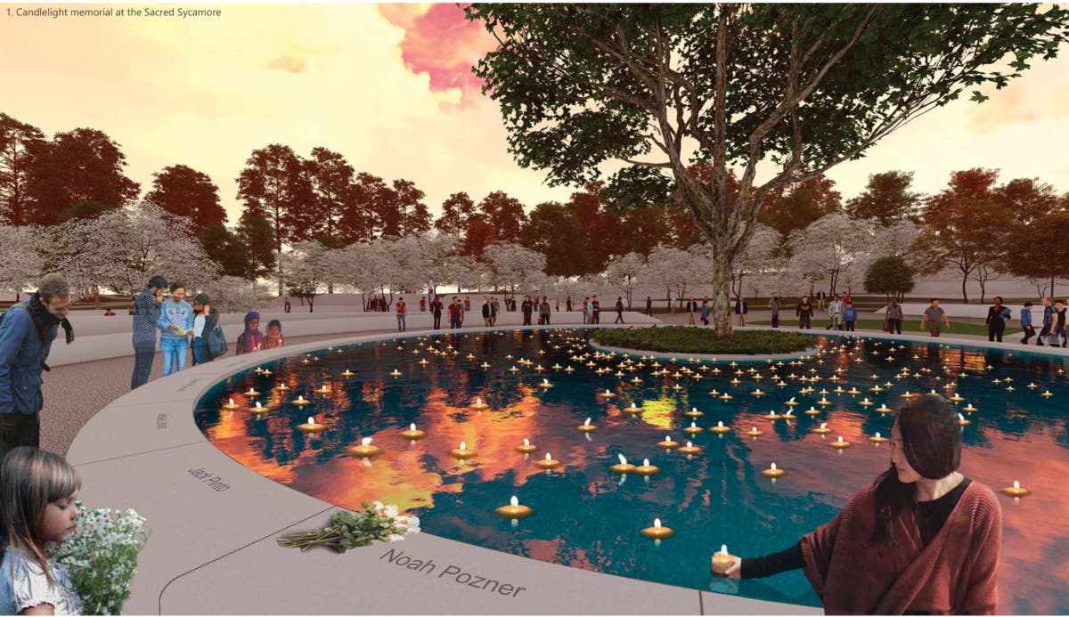 Besides their beauty, the four leading designs all share deeply symbolic composition. The design narrative for "The Clearing," depicted here, reads in part: "The center of the fountain is planted with a young sycamore, in remembrance of the young age at which many the victims were taken from us. American sycamores are durable, long lived, and fast growing trees. The mottled white bark represents the innocence of the victims."