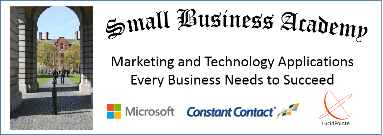 Designed to quickly build familiarity and competence with some of the most powerful small business tools available today, this five part series hosted by Microsoft, Constant Contact, and LucidPointe (a Microsoft and Constant Contact partner) makes it easy and convenient to learn about these critical tools and applications.