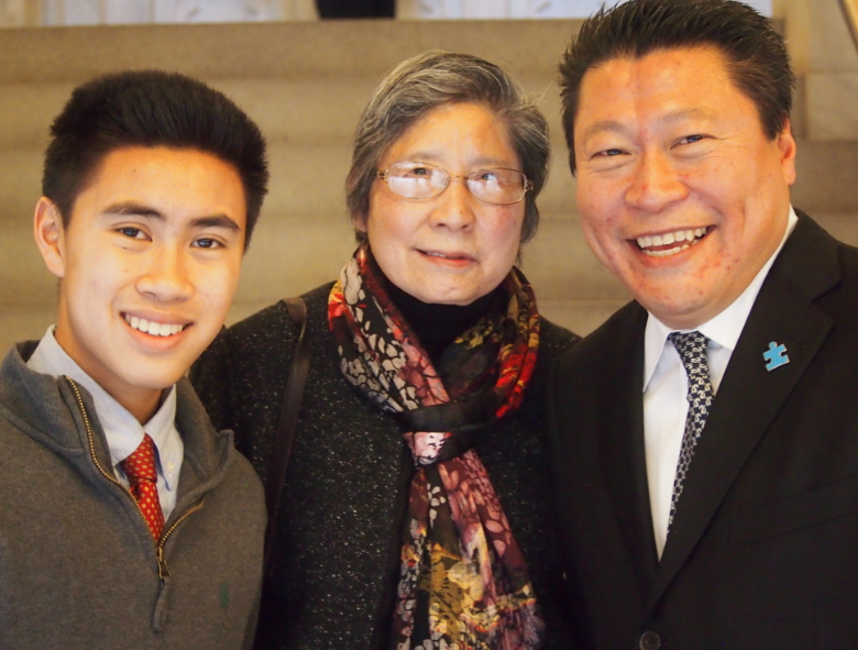 Photo Caption: State Sen. Tony Hwang (R-28) had his mother, Chi-Wha, and son, Peter, by his side as he took the oath of office on Jan. 7, 2015.