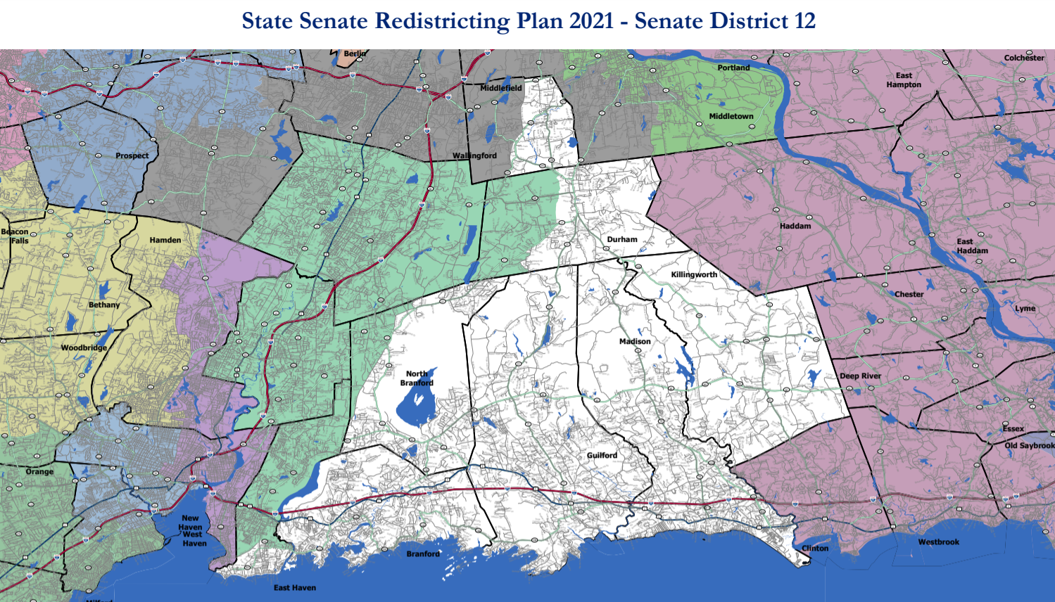 The district boundaries continue to encompass Guilford, Madison, Branford, North Branford, Killingworth and part of Durham, with the addition of portions of East Haven and Middlefield.